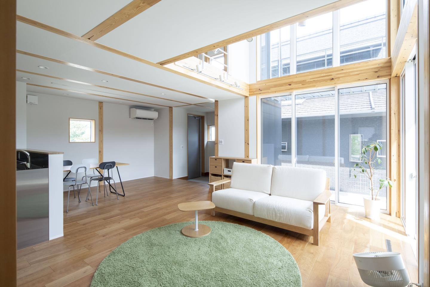 無印良品の家「木の家」は、吹抜けを中心とした間仕切りがない一室空間で、開放感がありながらも高い耐震性があります。大きな窓には伝統的な日本家屋の庇(ひさし)の仕組みが取り入れられ、四季を通して快適な室内環境が実現できる知恵も生かされています。