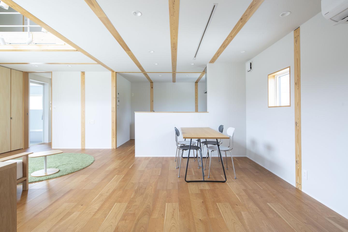 無印良品の家「木の家」は、吹抜けを中心とした間仕切りがない一室空間で、開放感がありながらも高い耐震性があります。大きな窓には伝統的な日本家屋の庇(ひさし)の仕組みが取り入れられ、四季を通して快適な室内環境が実現できる知恵も生かされています。